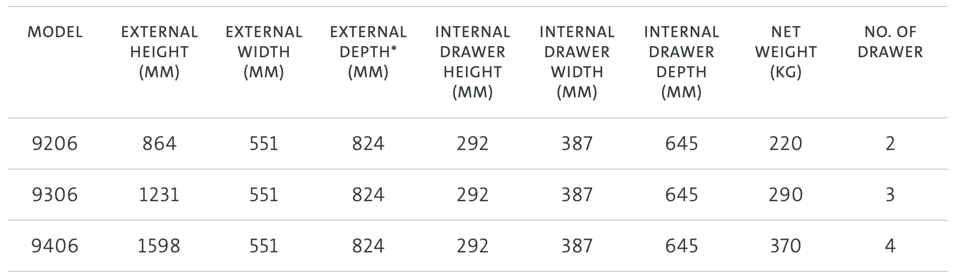 Overall body thickness of 57mm insulated with Chubbsafes patented PCDE fire resistant material. The cabinet is reinforced in critical areas to allow the cabinet to survive the impact from a fall. The drawers constructed with an overall thickness of 56mm.