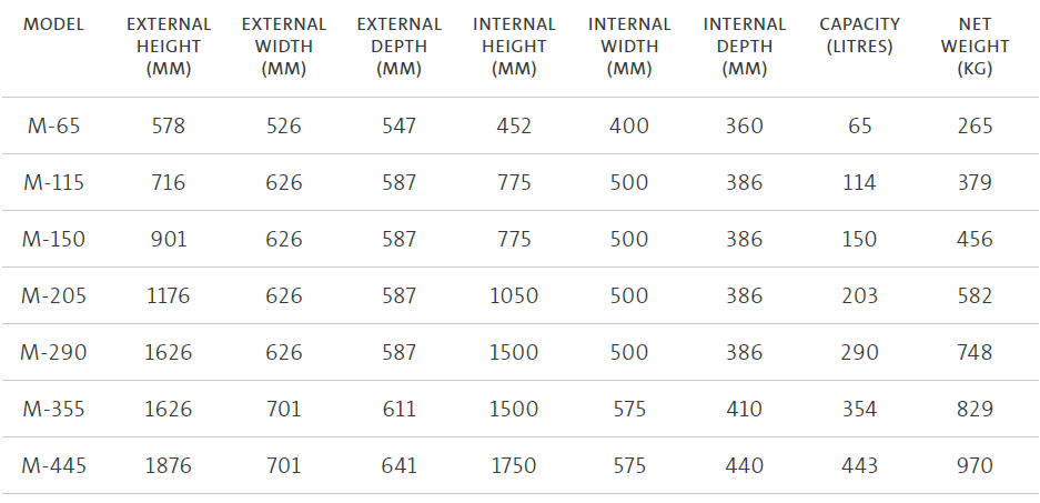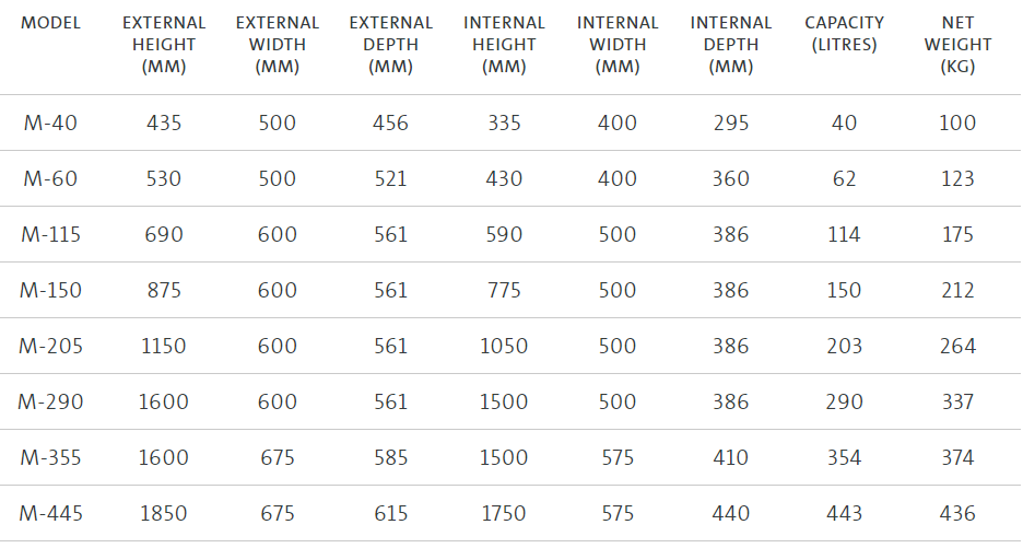 A wide variety of sizes to meet commercial premises and office needs – 8 sizes available for Grade I, 40 litres to 450 litres, and 7 sizes available for Grade II, 65 litres to 450 litres