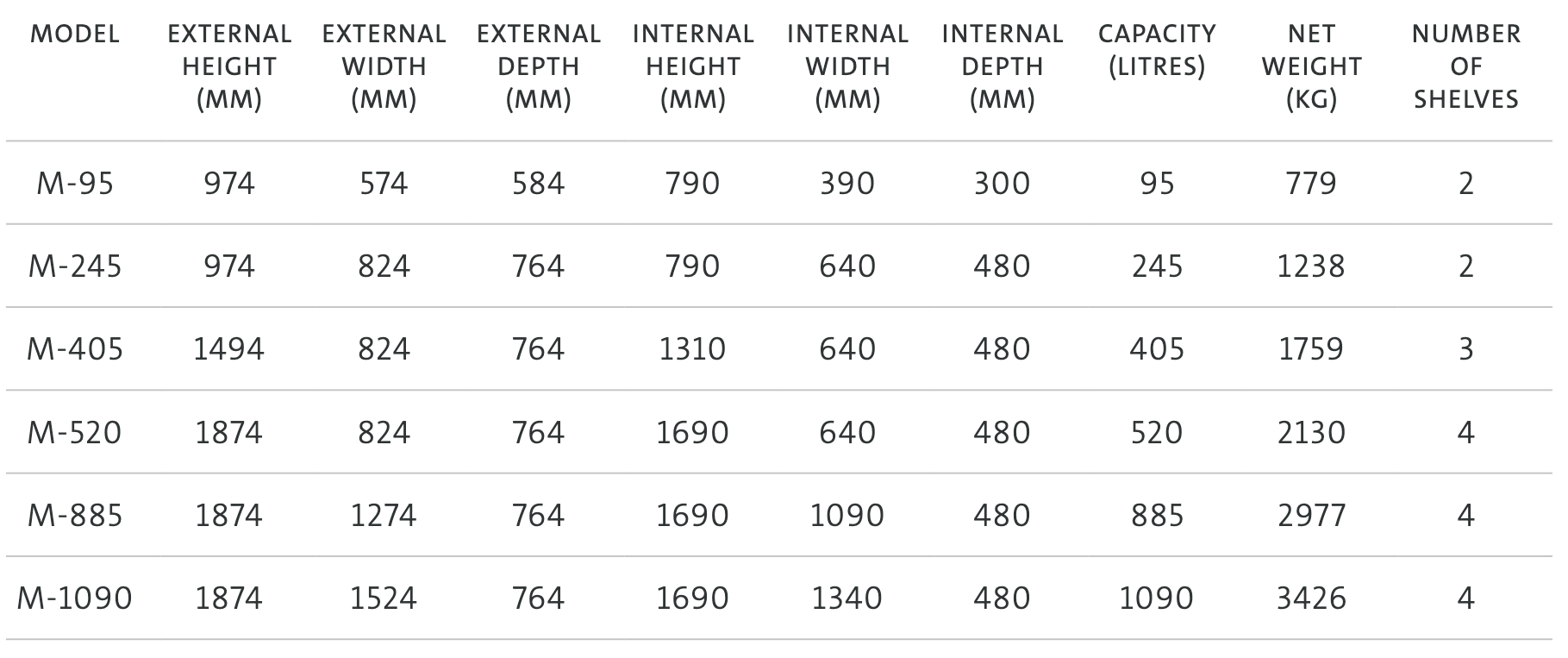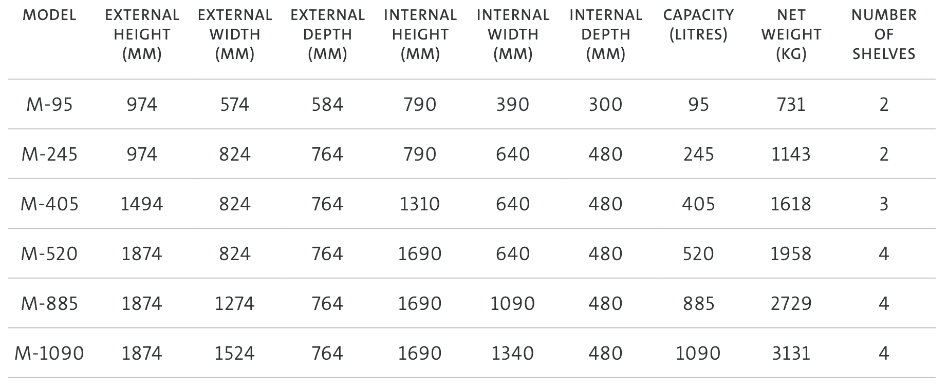 External dimensions exclude handle and hinge projections. In line with certification, weights can vary by +/- 5%.