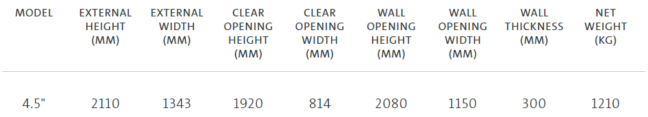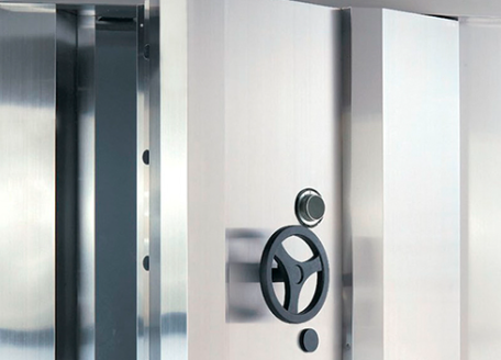 The overall door thickness of 251 mm with a solid door slab that has a protective thickness of 114 mm forms the basis of the door. Filled with a specifically formulated F80 barrier material, reinforced with steel fibers.